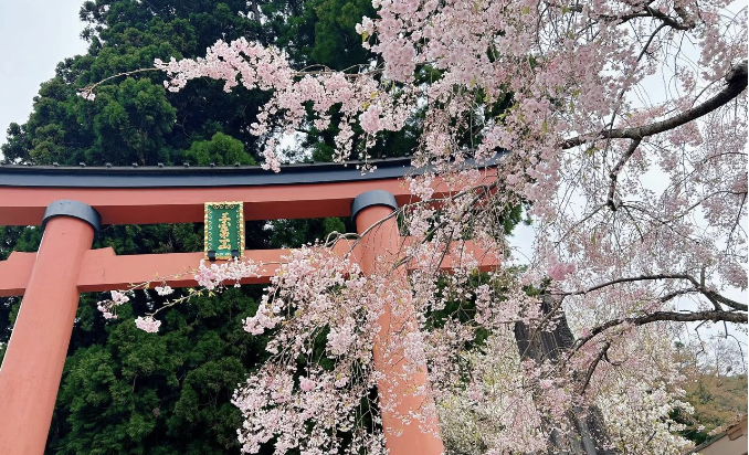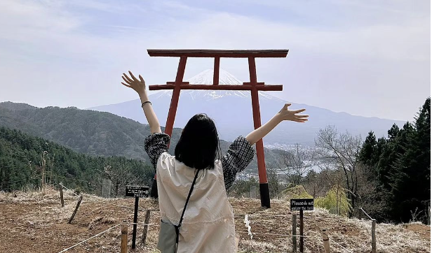 When cherry blossoms bloom in spring, the scenery becomes even more magical. Soft pink petals frame the clear blue sky and the snowy peak, turning the entire view into something straight out of a postcard.
