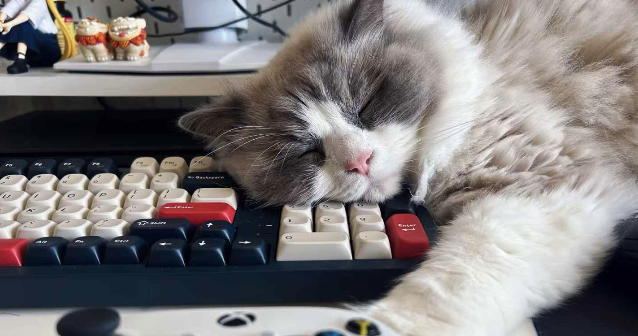 No matter how big the desk is, the keyboard is always his chosen bed.